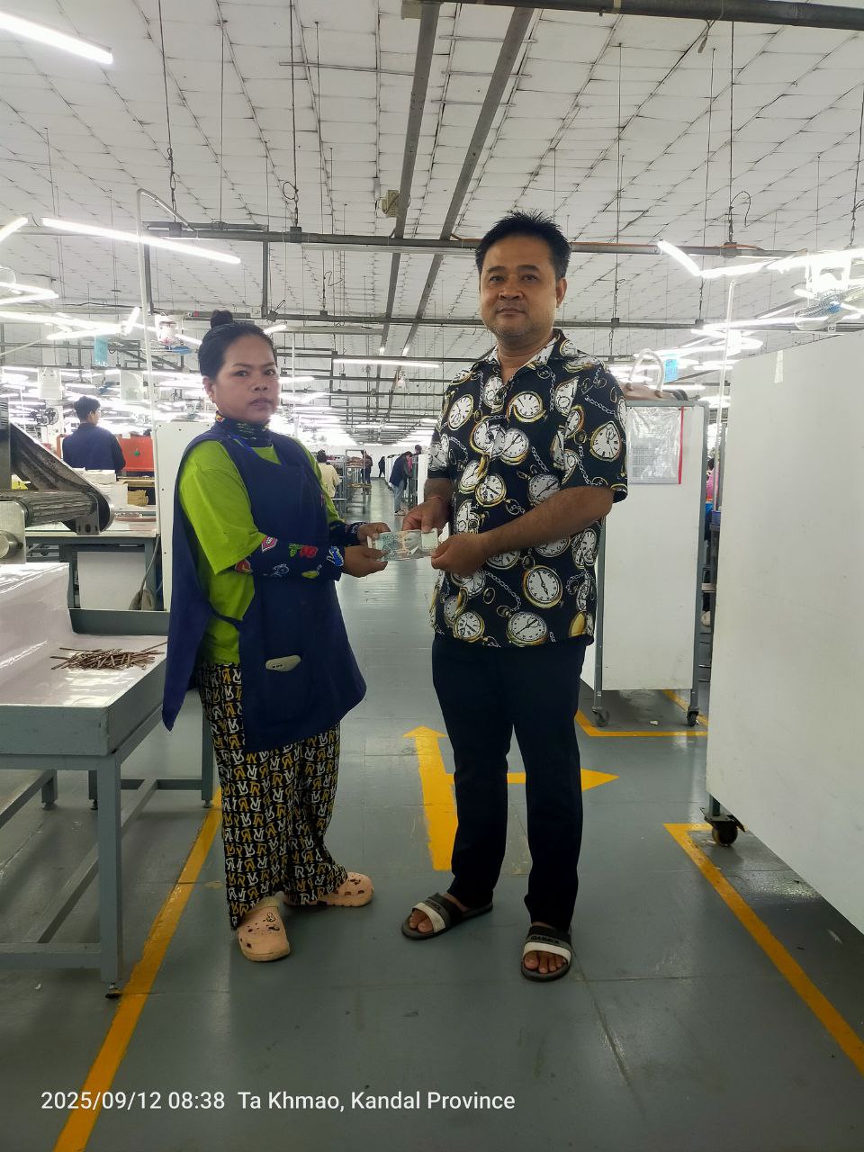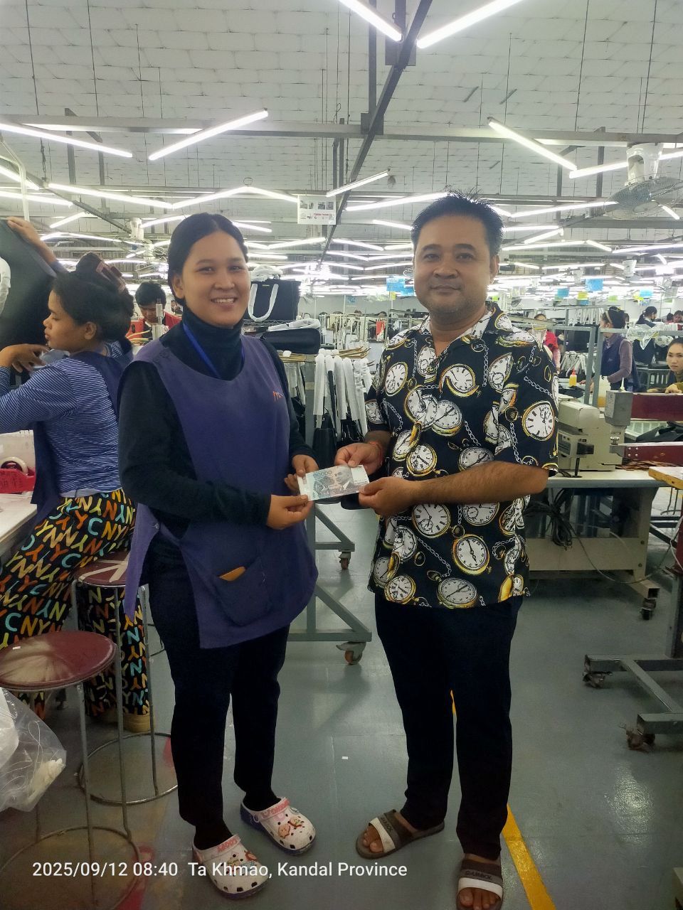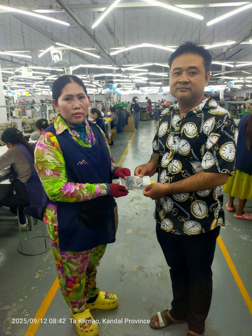 កណ្ដាល៖ នៅថ្ងៃទី១៣ ខែកញ្ញា ឆ្នាំ២០២៥ ដោយមានការអនុញ្ញាតពីលោក លី វិចិត្រ ប្រធានសហព័ន្ធសហជីពទឹកចិត្តកម្មករកម្ពុជា លោក ហ៊ីន ម៉ៃ តំណាងសហជីពទឹកចិត្តកម្មករកម្ពុជា ប្រចាំក្រុមហ៊ុន អេហ្វ អិម អេហ្វ មេនូហ្វេកធើរីង ឯ.ក ដែលមានអាសយដ្ឋាននៅ ភូមិបត្តាជី១ សង្កាត់ព្រែកហូរ ក្រុងតាខ្មៅ ខេត្តកណ្តាល ។ បានផ្ដល់ប្រាក់ឧបត្ថម្ភចំនួន៤០០,០០០រៀលជូនសមាជិកសហជីពចំនួន៥នាក់ ក្នុងនោះរួមមាន៖
