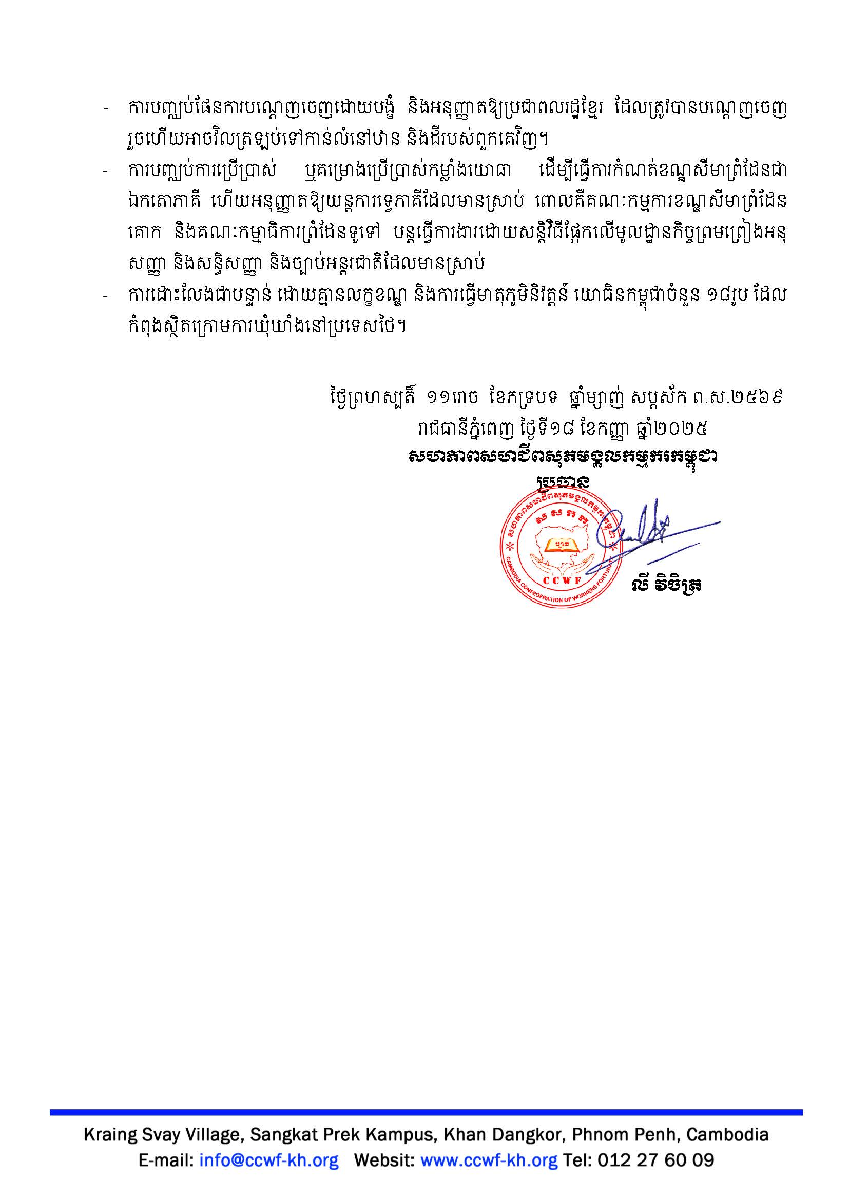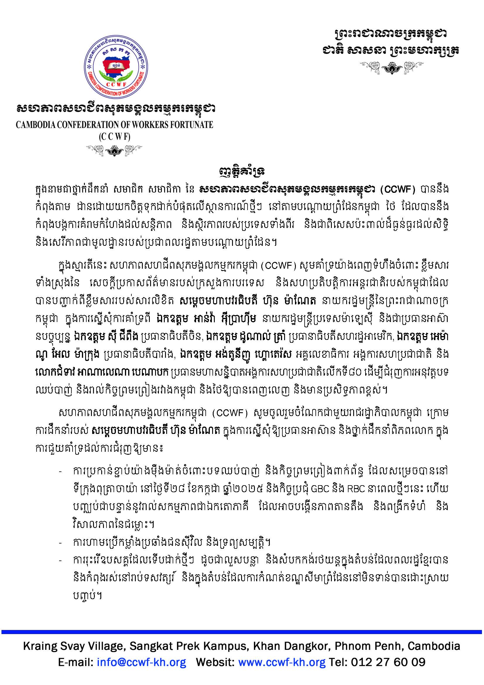ក្នុងស្មារតីនេះ សហភាពសហជីពសុភមង្គលកម្មករកម្ពុជា (CCWF) សូមគាំទ្រយ៉ាងពេញទំហឹងចំពោះ ខ្លឹមសារទាំងស្រុងនៃ សេចក្តីប្រកាសព័ត៌មានរបស់ក្រសួងការបរទេស និងសហប្រតិបត្តិការអន្តរជាតិរបស់កម្ពុជាដែលបានបញ្ជាក់ពីខ្លឹមសាររបស់សារលិខិត សម្តេចមហាបវរធិបតី ហ៊ុន ម៉ាណែត នាយករដ្ឋមន្ត្រីនៃព្រះរាជាណាចក្រកម្ពុជា ក្នុងការស្នើសុំការគាំទ្រពី ឯកឧត្តម អាន់វ៉ា អ៊ីប្រាហ៊ីម នាយករដ្ឋមន្ត្រីប្រទេសម៉ាឡេស៊ី និងជាប្រធានអាស៊ានបច្ចុប្បន្ន ឯកឧត្តម ស៊ី ជីពឹង ប្រធានាធិបតីចិន, ឯកឧត្តម ដូណាល់ ត្រាំ ប្រធានាធិបតីសហរដ្ឋអាមេរិក, ឯកឧត្តម អេម៉ាណូ អែល ម៉ាក្រុង ប្រធានាធិបតីបារាំង, ឯកឧត្តម អង់តូនីញូ ហ្គោតេរ៉ស អគ្គលេខាធិការ អង្គការសហប្រជាជាតិ និងលោកជំទាវ អាណាលេណា បេណាបក ប្រធានមហាសន្និបាតអង្គការសហប្រជាជាតិលើកទី៨០ ដើម្បីជំរុញការអនុវត្តបទឈប់បាញ់ និងរាល់កិច្ចព្រមព្រៀងរវាងកម្ពុជា និងថៃឱ្យបានពេញលេញ និងមានប្រសិទ្ធភាពខ្ពស់។