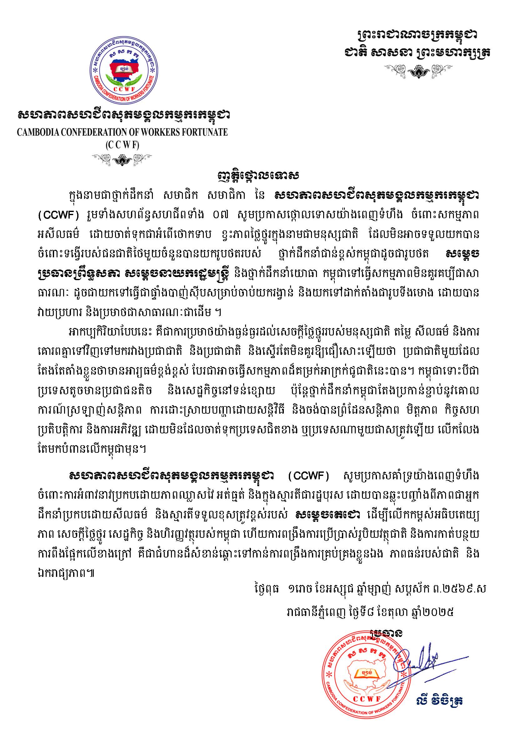 ក្នុងនាមជាថ្នាក់ដឹកនាំ សមាជិក សមាជិកា នៃ សហភាពសហជីពសុភមង្គលកម្មករកម្ពុជា (CCWF) រួមទាំងសហព័ន្ធសហជីពទាំង ០៧ សូមប្រកាសថ្កោលទោសយ៉ាងពេញទំហឹង ចំពោះសកម្មភាព អសីលធម៌ ដោយចាត់ទុកជាអំពើថោកទាប ខ្វះភាពថ្លៃថ្នូរក្នុងនាមជាមនុស្សជាតិ ដែលមិនអាចទទួលយកបានចំពោះទង្វើរបស់ជនជាតិថៃមួយចំនួនបានយករូបថតរបស់ ថ្នាក់ដឹកនាំជាន់ខ្ពស់កម្ពុជាដូចជារូបថត សម្តេចប្រធានព្រឹទ្ធសភា សម្តេចនាយករដ្ឋមន្ត្រី និងថ្នាក់ដឹកនាំយោធា កម្ពុជាទៅធ្វើសកម្មភាពមិនគួរគប្បីជាសាធារណៈ ដូចជាយកទៅធ្វើជាផ្ទាំងបាញ់ស៊ីបសម្រាប់ចាប់យករង្វាន់ និងយកទៅដាក់តាំងជារូបទីងមោង ដោយបានវាយប្រហារ និងប្រមាថជាសាធារណៈជាដើម ។