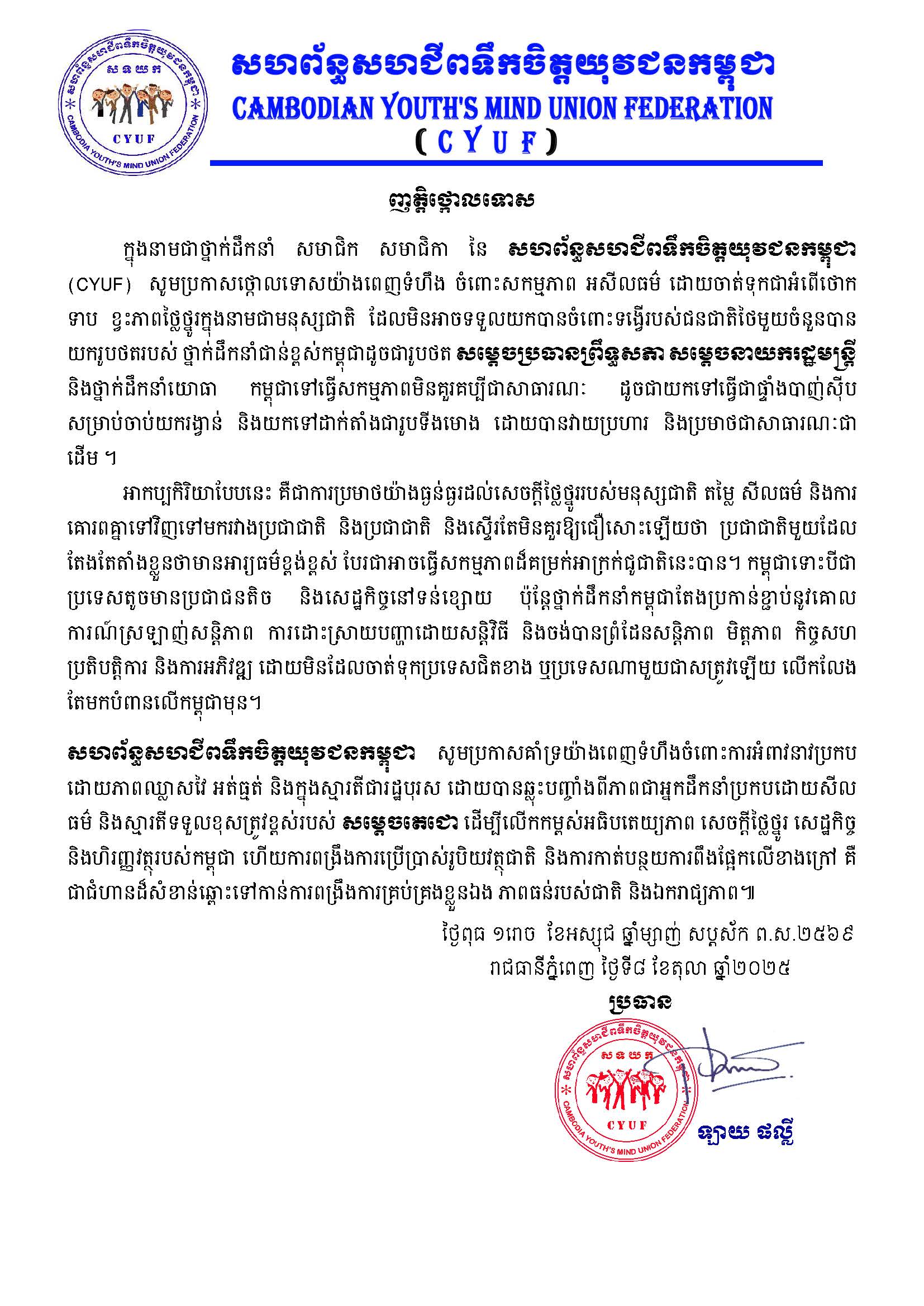 ក្នុងនាមជាថ្នាក់ដឹកនាំ សមាជិក សមាជិកា នៃ​ សហព័ន្ធសហជីពទឹកចិត្តយុវជនកម្ពុជា (CYUF)  សូមប្រកាសថ្កោលទោសយ៉ាងពេញទំហឹង ចំពោះសកម្មភាព អសីលធម៌ ដោយចាត់ទុកជាអំពើថោកទាប ខ្វះភាពថ្លៃថ្នូរក្នុងនាមជាមនុស្សជាតិ ដែលមិនអាចទទួលយកបានចំពោះទង្វើរបស់ជនជាតិថៃមួយចំនួនបានយករូបថតរបស់ ថ្នាក់ដឹកនាំជាន់ខ្ពស់កម្ពុជាដូចជារូបថត សម្តេចប្រធានព្រឹទ្ធសភា សម្តេចនាយករដ្ឋមន្ត្រី និងថ្នាក់ដឹកនាំយោធា កម្ពុជាទៅធ្វើសកម្មភាពមិនគួរគប្បីជាសាធារណៈ ដូចជាយកទៅធ្វើជាផ្ទាំងបាញ់ស៊ីបសម្រាប់ចាប់យករង្វាន់ និងយកទៅដាក់តាំងជារូបទីងមោង ដោយបានវាយប្រហារ និងប្រមាថជាសាធារណៈជាដើម