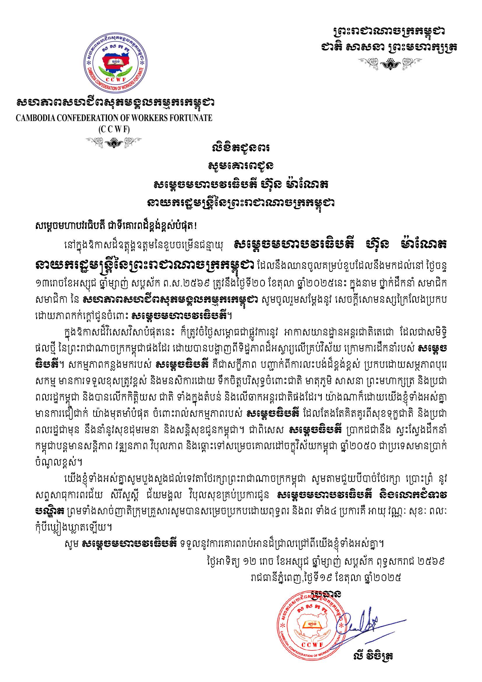 នៅក្នុងឱកាសដ៏ឧត្តុង្គឧត្ដមនៃខួបចម្រើនជន្មាយុ សម្ដេចមហាបវរធិបតី ហ៊ុន ម៉ាណែត នាយករដ្ឋមន្ត្រីនៃព្រះរាជាណាចក្រកម្ពុជា ដែលនឹងឈានចូលគម្រប់ខួបដែលនឹងមកដល់នៅ ថ្ងៃចន្ទ ១៣រោចខែអស្សុជ ឆ្នាំម្សាញ់ សប្តស័ក ព.ស.២៥៦៩ ត្រូវនឹងថ្ងៃទី២០ ខែតុលា ឆ្នាំ២០២៥នេះ ក្នុងនាម ថ្នាក់ដឹកនាំ សមាជិក សមាជិកា នៃ សហភាពសហជីពសុភមង្គលកម្មករកម្ពុជា សូមចូលរួមសម្ដែងនូវ សេចក្តីសោមនស្សក្រៃលែងប្រកប ដោយភាពកក់ក្តៅជូនចំពោះ សម្ដេចមហាបវរធិបតី។