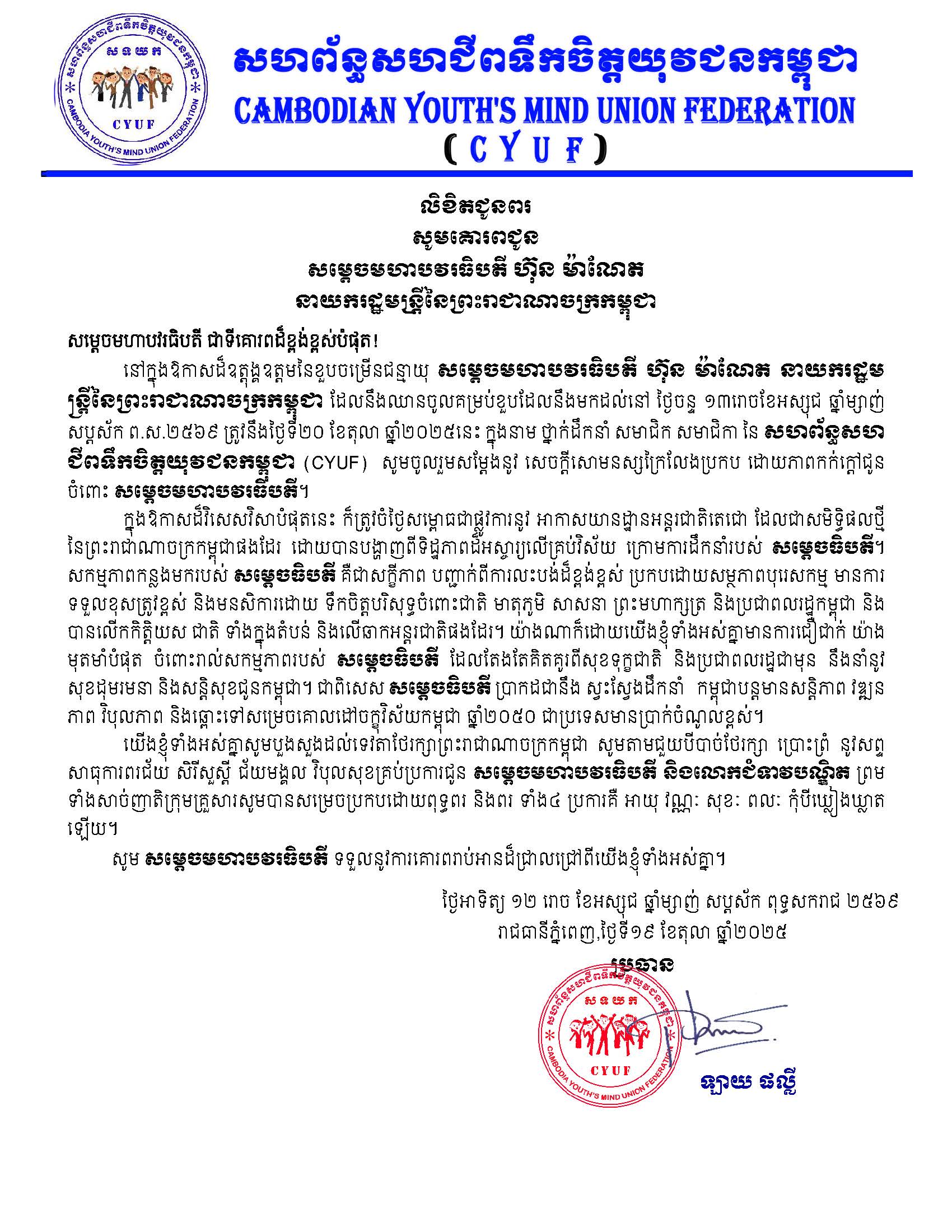 នៅក្នុងឱកាសដ៏ឧត្តុង្គឧត្ដមនៃខួបចម្រើនជន្មាយុ សម្ដេចមហាបវរធិបតី ហ៊ុន ម៉ាណែត នាយករដ្ឋមន្ត្រីនៃព្រះរាជាណាចក្រកម្ពុជា ដែលនឹងឈានចូលគម្រប់ខួបដែលនឹងមកដល់នៅ ថ្ងៃចន្ទ ១៣រោចខែអស្សុជ ឆ្នាំម្សាញ់ សប្តស័ក ព..២៥៦៩ ត្រូវនឹងថ្ងៃទី២០ ខែតុលា ឆ្នាំ២០២៥នេះ ក្នុងនាម ថ្នាក់ដឹកនាំ សមាជិក សមាជិកា នៃ សហព័ន្ធសហជីពទឹកចិត្តយុវជនកម្ពុជា (CYUF)  សូមចូលរួមសម្ដែងនូវ សេចក្តីសោមនស្សក្រៃលែងប្រកប ដោយភាពកក់ក្តៅជូនចំពោះ សម្ដេចមហាបវរធិបតី