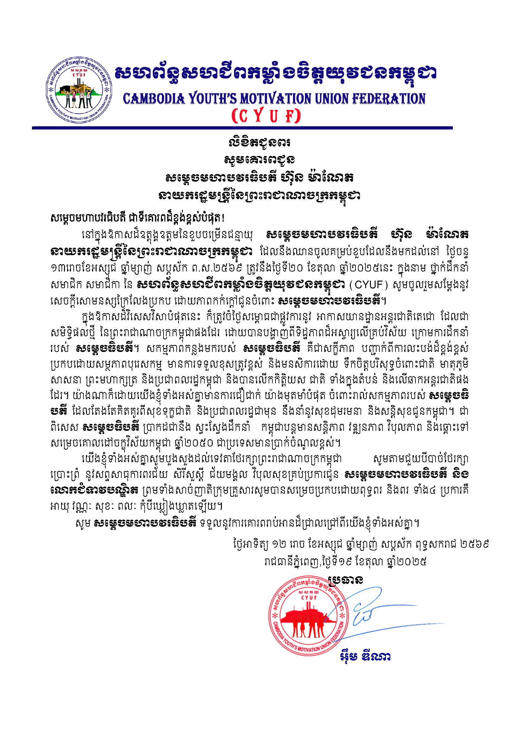 នៅក្នុងឱកាសដ៏ឧត្តុង្គឧត្ដមនៃខួបចម្រើនជន្មាយុ សម្ដេចមហាបវរធិបតី ហ៊ុន ម៉ាណែត នាយករដ្ឋមន្ត្រីនៃព្រះរាជាណាចក្រកម្ពុជា ដែលនឹងឈានចូលគម្រប់ខួបដែលនឹងមកដល់នៅ ថ្ងៃចន្ទ ១៣រោចខែអស្សុជ ឆ្នាំម្សាញ់ សប្តស័ក ព..២៥៦៩ ត្រូវនឹងថ្ងៃទី២០ ខែតុលា ឆ្នាំ២០២៥នេះ ក្នុងនាម ថ្នាក់ដឹកនាំ សមាជិក សមាជិកា នៃ សហព័ន្ធសហជីពកម្លាំងចិត្តយុវជនកម្ពុជា (CYUF) សូមចូលរួមសម្ដែងនូវ សេចក្តីសោមនស្សក្រៃលែងប្រកប ដោយភាពកក់ក្តៅជូនចំពោះ សម្ដេចមហាបវរធិបតី