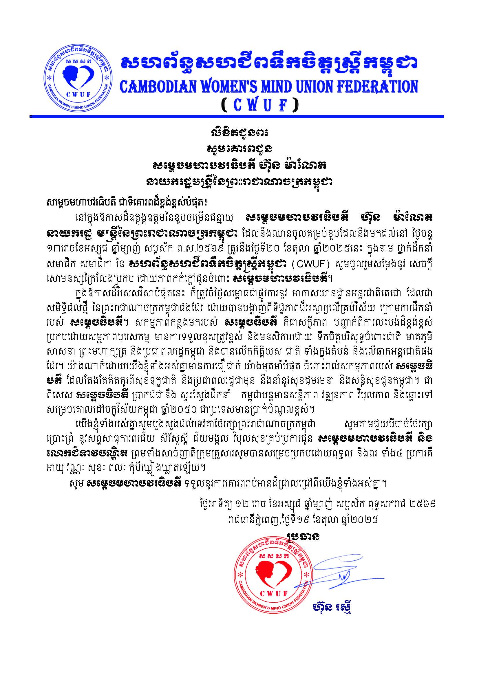 នៅក្នុងឱកាសដ៏ឧត្តុង្គឧត្ដមនៃខួបចម្រើនជន្មាយុ សម្ដេចមហាបវរធិបតី ហ៊ុន ម៉ាណែត នាយករដ្ឋ មន្ត្រីនៃព្រះរាជាណាចក្រកម្ពុជា ដែលនឹងឈានចូលគម្រប់ខួបដែលនឹងមកដល់នៅ ថ្ងៃចន្ទ ១៣រោចខែអស្សុជ ឆ្នាំម្សាញ់ សប្តស័ក ព..២៥៦៩ ត្រូវនឹងថ្ងៃទី២០ ខែតុលា ឆ្នាំ២០២៥នេះ ក្នុងនាម ថ្នាក់ដឹកនាំ សមាជិក សមាជិកា នៃ សហព័ន្ធសហជីពទឹកចិត្តស្រ្តីកម្ពុជា (CWUF) សូមចូលរួមសម្ដែងនូវ សេចក្តីសោមនស្សក្រៃលែងប្រកប ដោយភាពកក់ក្តៅជូនចំពោះ សម្ដេចមហាបវរធិបតី