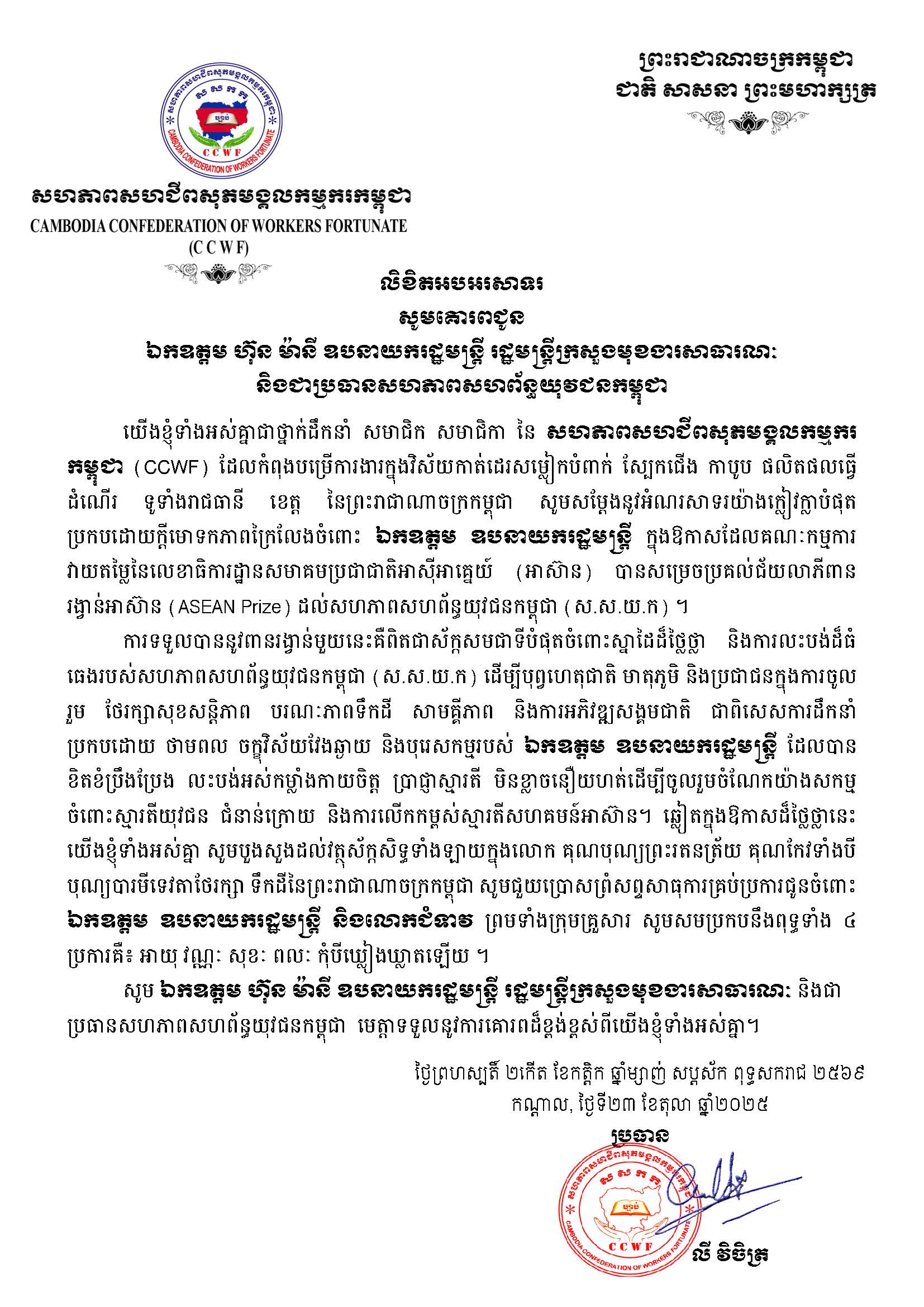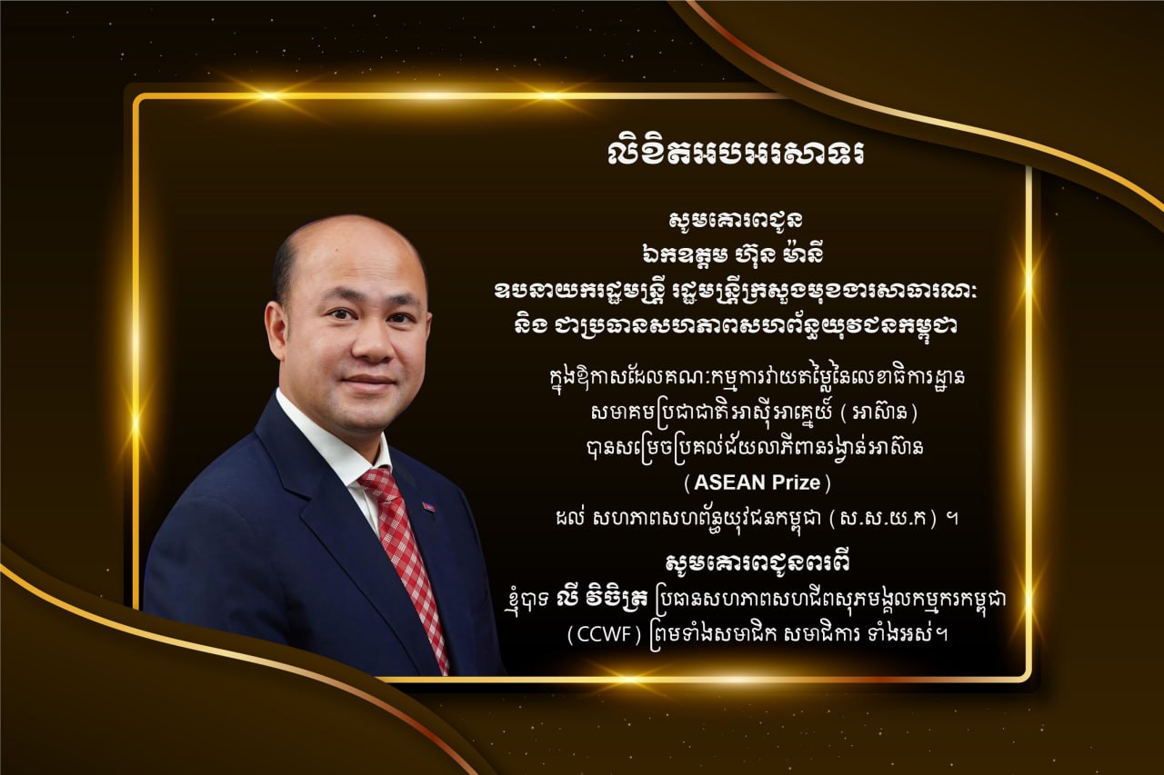 យើងខ្ញុំទាំងអស់គ្នាជាថ្នាក់ដឹកនាំ សមាជិក សមាជិកា នៃ សហភាពសហជីពសុភមង្គលកម្មករកម្ពុជា (CCWF) ដែលកំពុងបម្រើការងារក្នុងវិស័យកាត់ដេរសម្លៀកបំពាក់ ស្បែកជើង កាបូប ផលិតផលធ្វើដំណើរ ទូទាំងរាជធានី ខេត្ត នៃព្រះរាជាណាចក្រកម្ពុជា សូមសម្តែងនូវអំណរសាទរយ៉ាងក្លៀវក្លាបំផុតប្រកបដោយក្តីមោទកភាពក្រៃលែងចំពោះ ឯកឧត្តម ឧបនាយករដ្ឋមន្រ្តី ក្នុងឱកាសដែលគណៈកម្មការវាយតម្លៃនៃលេខាធិការដ្ឋានសមាគមប្រជាជាតិអាស៊ីអាគ្នេយ៍ (អាស៊ាន) បានសម្រេចប្រគល់ជ័យលាភីពានរង្វាន់អាស៊ាន (ASEAN Prize) ដល់សហភាពសហព័ន្ធយុវជនកម្ពុជា (ស.ស.យ.ក) ។