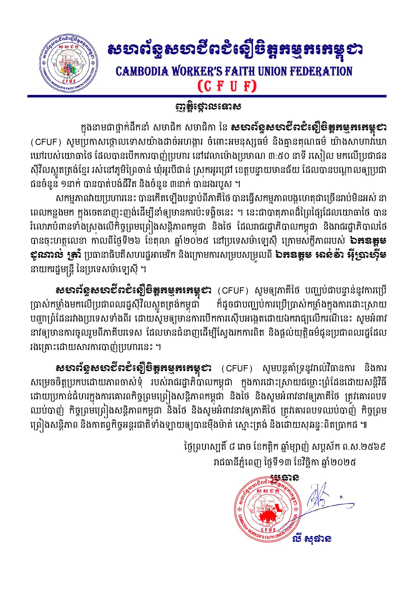 ក្នុងនាមជាថ្នាក់ដឹកនាំ សមាជិក សមាជិកា នៃ សហព័ន្ធសហជីពជំនឿចិត្តកម្មករកម្ពុជា (CFUF) សូមប្រកាសថ្កោលទោសយ៉ាងដាច់អហង្ការ ចំពោះអមនុស្សធម៌ និងគ្មានគុណធម៌ យ៉ាងសាហាវឃោឃៅរបស់យោធាថៃ ដែលបានបើកការបាញ់ប្រហារ នៅវេលាម៉ោងប្រមាណ ៣:៥០ នាទី រសៀល មកលើប្រជាជន ស៊ីវិលស្លូតត្រង់ខ្មែរ រស់នៅភូមិព្រៃចាន់ ឃុំអូរបីជាន់ ស្រុកអូរជ្រៅ ខេត្តបន្ទាយមានជ័យ ដែលបានបណ្តាលឲ្យប្រជាជនចំនួន ១នាក់ បានបាត់បង់ជីវិត និងចំនួន ៣នាក់ បានរងរបួស ។