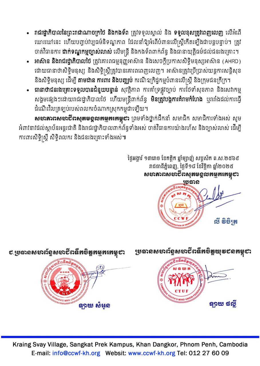 ក្នុងនាមជាថ្នាក់ដឹកនាំ សមាជិក សមាជិកា នៃ សហភាពសហជីពសុភមង្គលកម្មករកម្ពុជា ដែលជាអង្គការវិជ្ជាជីវៈតំណាងឱ្យកម្មករនិយោជិត ក្នុងវិស័យវាយនភ័ណ្ឌកាត់ដេរ, ផលិតស្បែកជើង និងកាបូប ដែលកំពុងបម្រើការងារនៅតាមរោងចក្រ សហគ្រាស គ្រឹះស្ថាននានា នៅក្នុងព្រះរាជាណាចក្រកម្ពុជា សូមថ្កោលទោសយ៉ាងដាច់អហង្ការ ចំពោះអំពើហិង្សា និងការរំលោភបំពានផ្លូវភេទដ៏សាហាវ ដែលបានប្រព្រឹត្តទៅលើ ពលការិនីចំណាកស្រុកកម្ពុជា ដោយកងទ័ពឈុតខ្មៅថៃនៅតាមតំបន់ព្រំដែនកម្ពុជា-ថៃ។ អំពើនេះគឺជាការ រំលោភបំពានយ៉ាងធ្ងន់ធ្ងរ លើសិទ្ធិមនុស្ស សិទ្ធិស្ត្រី និងសិទ្ធិជាតិនៃពលករចំណាកស្រុក ដែលត្រូវបានការពារយ៉ាងខ្ជាប់ខ្ជួនដោយច្បាប់ជាតិ ធម្មនុញ្ញ លិខិតតុបករណ៍អាស៊ាន ច្បាប់អន្តរជាតិ និងអនុសញ្ញា CEDAW ។ ករណីរំលោភបំពានដ៏ឃោរឃៅដែលមិនអាចទទួលយកបាននេះ មិនត្រឹមតែជាអំពើអមនុស្សធម៌ទៅលើជនរងគ្រោះប៉ុណ្ណោះទេ ប៉ុន្តែថែមទាំងជាការ បំពានលើគោលការណ៍មនុស្សធម៌ របស់សមាគមប្រជាជាតិអាស៊ីអាគ្នេយ៍ (ASEAN) ដែលមានបំណងលើកកម្ពស់ និងធានាសិទ្ធិមនុស្សនៅក្នុងតំបន់។ ជាងនេះទៅទៀត យើងខ្ញុំមានការ ព្រួយបារម្ភយ៉ាងខ្លាំង ចំពោះវប្បធម៌និទណ្ឌភាព (Impunity) និងការមិនគោរពសិទ្ធិនារី ពាក់ព័ន្ធនឹងកងកម្លាំងយោធាឈុតខ្មៅរបស់ថៃ ដែលបង្កហានិភ័យធ្ងន់ធ្ងរដល់សុវត្ថិភាព និងសិទ្ធិរបស់ពលការិនីកម្ពុជា និងក្រុមជនក្រីក្រចំណាកស្រុកដទៃទៀត។