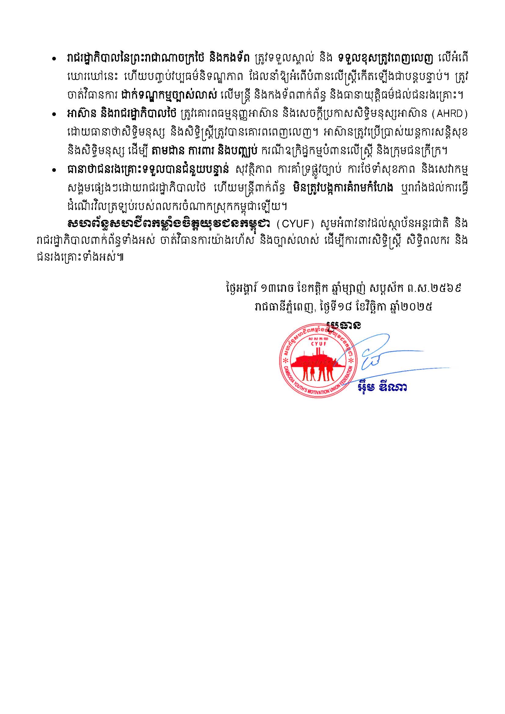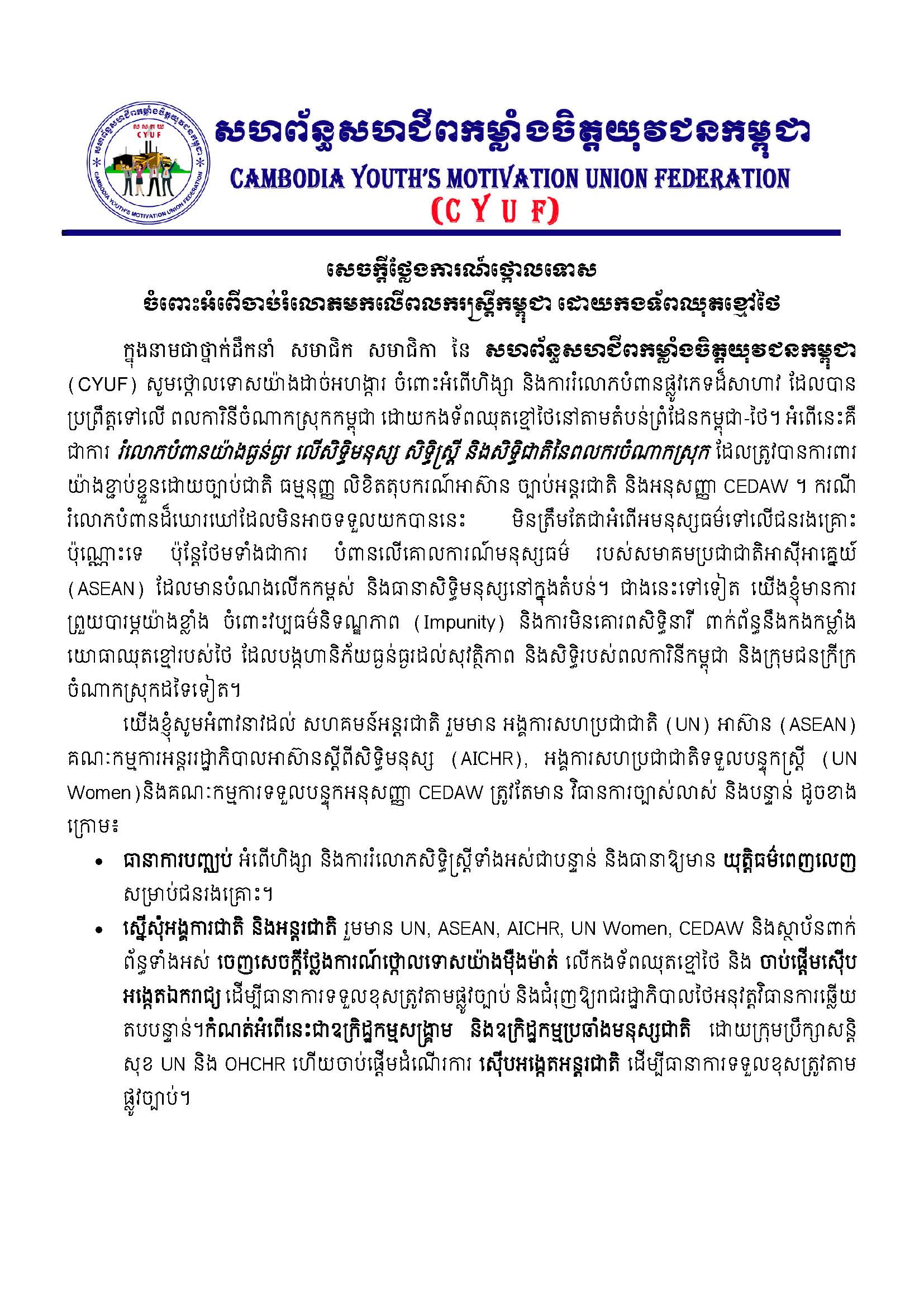 ក្នុងនាមជាថ្នាក់ដឹកនាំ សមាជិក សមាជិកា នៃ សហព័ន្ធសហជីពកម្លាំងចិត្តយុវជនកម្ពុជា ដែលជាអង្គការវិជ្ជាជីវៈតំណាងឱ្យកម្មករនិយោជិត ក្នុងវិស័យវាយនភ័ណ្ឌកាត់ដេរ, ផលិតស្បែកជើង និងកាបូប ដែលកំពុងបម្រើការងារនៅតាមរោងចក្រ សហគ្រាស គ្រឹះស្ថាននានា នៅក្នុងព្រះរាជាណាចក្រកម្ពុជា សូមថ្កោលទោសយ៉ាងដាច់អហង្ការ ចំពោះអំពើហិង្សា និងការរំលោភបំពានផ្លូវភេទដ៏សាហាវ ដែលបានប្រព្រឹត្តទៅលើ ពលការិនីចំណាកស្រុកកម្ពុជា ដោយកងទ័ពឈុតខ្មៅថៃនៅតាមតំបន់ព្រំដែនកម្ពុជា-ថៃ។ អំពើនេះគឺជាការ រំលោភបំពានយ៉ាងធ្ងន់ធ្ងរ លើសិទ្ធិមនុស្ស សិទ្ធិស្ត្រី និងសិទ្ធិជាតិនៃពលករចំណាកស្រុក ដែលត្រូវបានការពារយ៉ាងខ្ជាប់ខ្ជួនដោយច្បាប់ជាតិ ធម្មនុញ្ញ លិខិតតុបករណ៍អាស៊ាន ច្បាប់អន្តរជាតិ និងអនុសញ្ញា CEDAW ។ ករណីរំលោភបំពានដ៏ឃោរឃៅដែលមិនអាចទទួលយកបាននេះ មិនត្រឹមតែជាអំពើអមនុស្សធម៌ទៅលើជនរងគ្រោះប៉ុណ្ណោះទេ ប៉ុន្តែថែមទាំងជាការ បំពានលើគោលការណ៍មនុស្សធម៌ របស់សមាគមប្រជាជាតិអាស៊ីអាគ្នេយ៍ (ASEAN) ដែលមានបំណងលើកកម្ពស់ និងធានាសិទ្ធិមនុស្សនៅក្នុងតំបន់។ ជាងនេះទៅទៀត យើងខ្ញុំមានការ ព្រួយបារម្ភយ៉ាងខ្លាំង ចំពោះវប្បធម៌និទណ្ឌភាព (Impunity) និងការមិនគោរពសិទ្ធិនារី ពាក់ព័ន្ធនឹងកងកម្លាំងយោធាឈុតខ្មៅរបស់ថៃ ដែលបង្កហានិភ័យធ្ងន់ធ្ងរដល់សុវត្ថិភាព និងសិទ្ធិរបស់ពលការិនីកម្ពុជា និងក្រុមជនក្រីក្រចំណាកស្រុកដទៃទៀត។