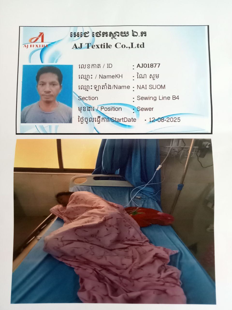 កំពង់ស្ពឺ៖ នៅថ្ងៃទី១៨ ខែវិច្ឆិកា ឆ្នាំ២០២៥ ដោយមានការអនុញ្ញាតពីលោក លី វិចិត្រ ប្រធានសហព័ន្ធសហជីពទឹកចិត្តកម្មករកម្ពុជា លោក ទិត សុភា និង​ លោក ឌី សំបានតំណាងសហជីពទឹកចិត្តកម្មករកម្ពុជា ប្រចាំក្រុមហ៊ុន អេជេ ថេកស្ថាយ ឯ.ក ដែលមានអាសយដ្ឋាននៅភូមិព្រីង ឃុំរលាំងចក ស្រុកសំរោងទង ខេត្ដកំពង់ស្ពឺ។ បានយកប្រាក់ឧបត្ថម្ភចំនួន២៦៣,៨០០រៀលជូនកម្មករម្នាក់ឈ្មោះ ណៃ សួម អត្តលេខ AJ01877 បម្រើការងារផ្នែកដេរ ក្រុមB4  មូលហេតុគឺប្រពន្ធរបស់គាត់បម្រើការងារផ្នែកអានាម័យបានឈឺធ្ងន់ហើយសម្រាកនៅមន្ទីពេទ្យ។