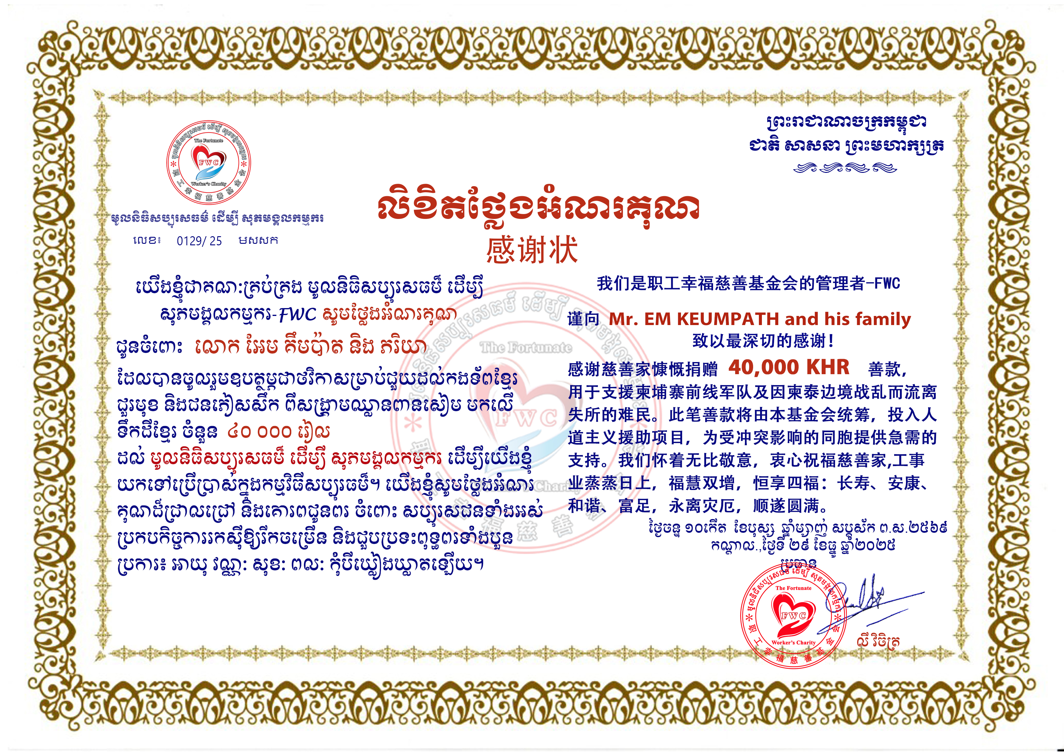 យើងខ្ញុំជាគណៈគ្រប់គ្រងមូលនិធីសប្បុរសធម៌ដើម្បីសុភមង្គលកម្មករ-FWCសូមថ្លែងអំណរគុណជូនចំពោះលោក អែម គឹមប៉ាត និង ភរិយាដែលបានឧបត្ថម្ភថវិកាសម្រាប់ជួយដល់កងទ័ពខ្មែរជួរមុខនិងជនភៀសសឹកពីសង្គ្រាមឈ្លានពានសៀមមកលើទឹកដីខ្មែរចំនួន៤០,០០០រៀលដល់មូលនិធិសប្បុរធម៌ដើម្បីសុភមង្គលកម្មករដើម្បីយើងខ្ញុំយកទៅប្រើប្រាស់ក្នុងកម្មវិធីសប្បុរសធម៌